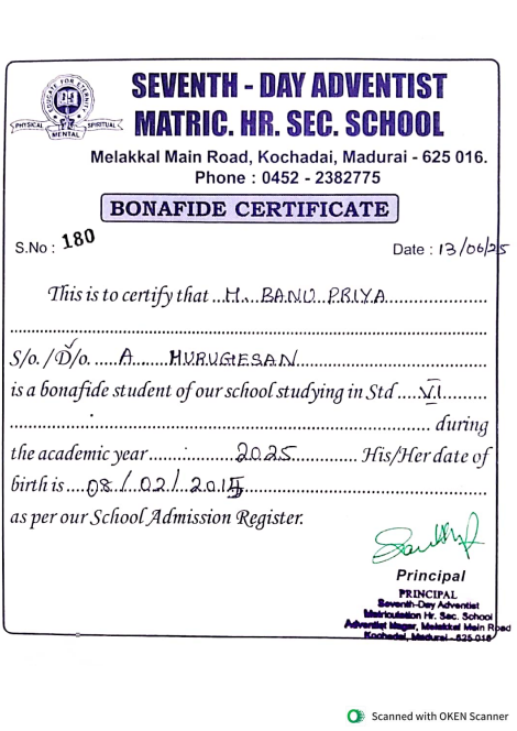 M. Banu Priya is a sixth-grade student at Seventh Day Adventist Matriculation Higher Secondary School in Madurai, Tamil Nadu. Her family is encountering considerable difficulties in providing her with an education due to their limited income. Education Empowerment for Women has granted her a scholarship, which will cover her schooling expenses and eliminate financial obstacles to her educational advancement.